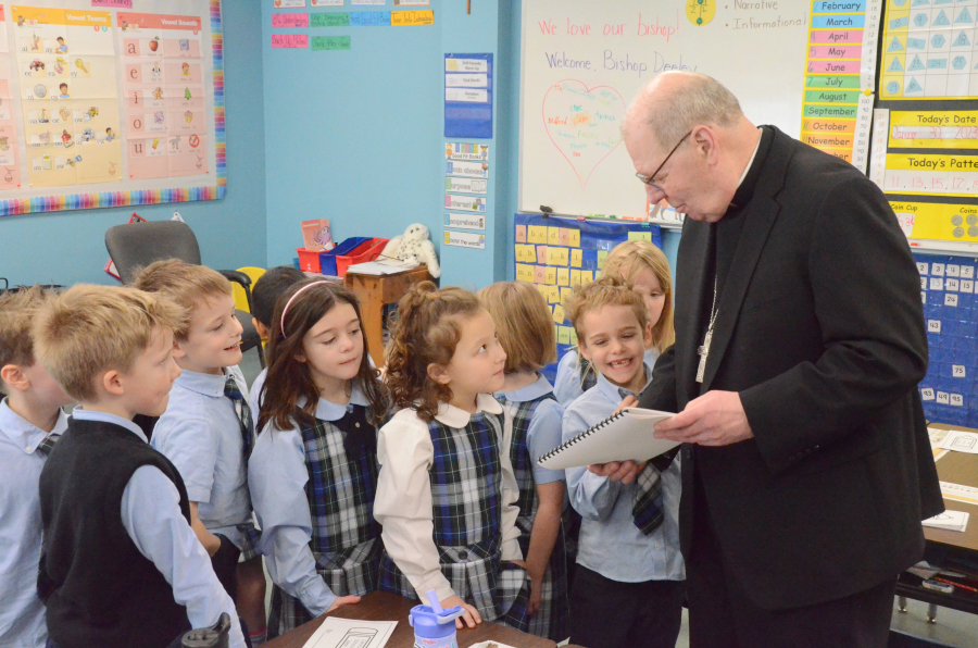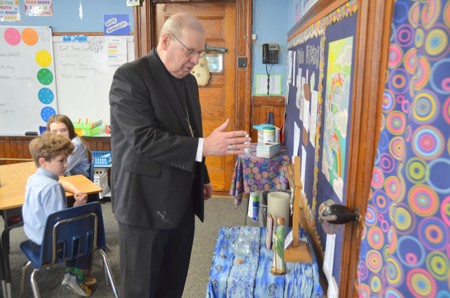 In kindergarten, the bishop read Jesus Came to Visit Me and fielded a “range” of questions.