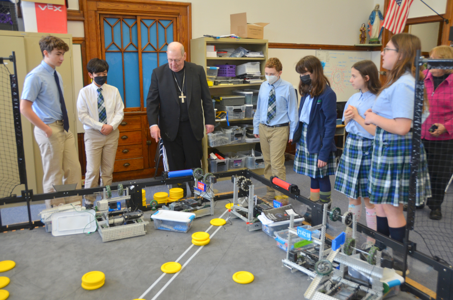 After being serenaded by the students who lined the halls of the elementary campus, Bishop Deeley made the short drive to the St. John Campus to spend time with the older students, an experience that featured the fourth graders detailed and researched presentations on Native Americans, discussing the sacrament of reconciliation with sixth graders, and being treated to a demonstration by the school’s award-winning robotics team and a tour of its amazing lab given by seventh graders. The fifth graders gave the bishop a “snow globe” it made with the bishop’s picture in the center, and they read a special poem they had written for the occasion entitled “I am Bishop Deeley” which included the many things the bishop represents to the Church in Maine.
